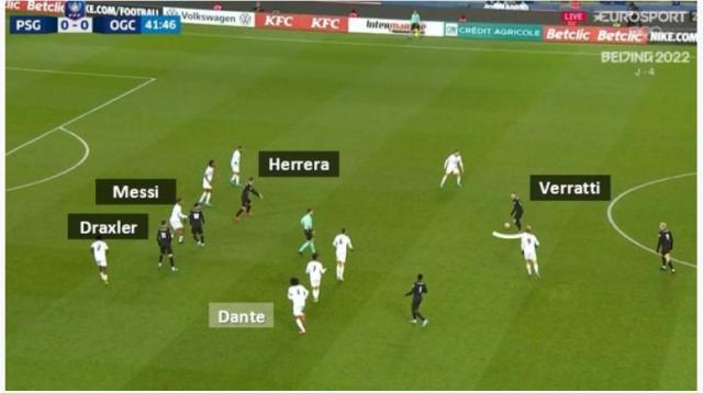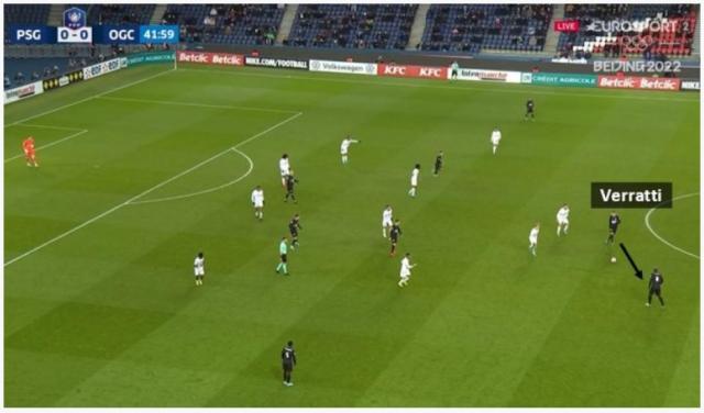 其实就是后防线球员站好位置,中前场球员切割巴黎圣日耳曼的球路这样简单。像比赛进行到第42分钟的时候,巴黎中场断球成功,当时尼斯的后防线领袖丹特不在自己的位置,但4个位置最靠后的队友组成了很紧凑的防线,中场有人挡住维拉蒂往侧翼分球的路线,这样维拉蒂如果往前传递,皮球就会掉进人堆里。